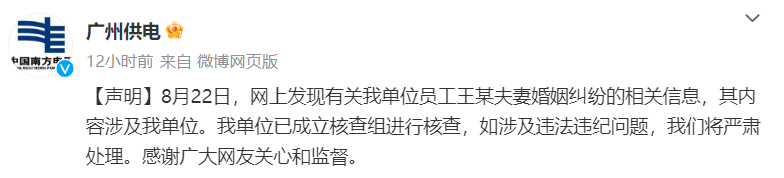 针对网传“广州供电局员工遭妻子举报行贿30万入职并遗弃病妻幼女”一事,8月22日晚,广州供电局官方微博发文称,当日,网上发现有关该单位员工王某夫妻婚姻纠纷的相关信息,其内容涉及该单位。该单位已成立核查组进行核查,如涉及违法违纪问题,将严肃处理。感谢广大网友关心和监督。