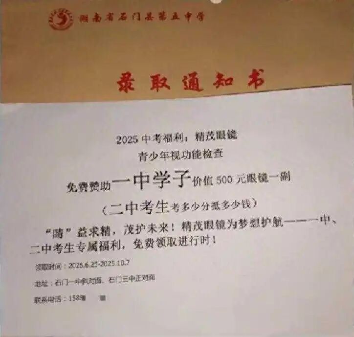 针对此事,7月21日石门县教育局发布情况通报称,经核查,该县各高中学校在制作密封录取通知书时均没有放入任何宣传单。各初中学校中,仅有一所镇中在发放录取通知书时,向34名学生在密封的录取通知书之外,同步发放了某眼镜店优惠宣传单。石门县教育局已约谈相关学校负责同志,并将依纪依规进行处理。